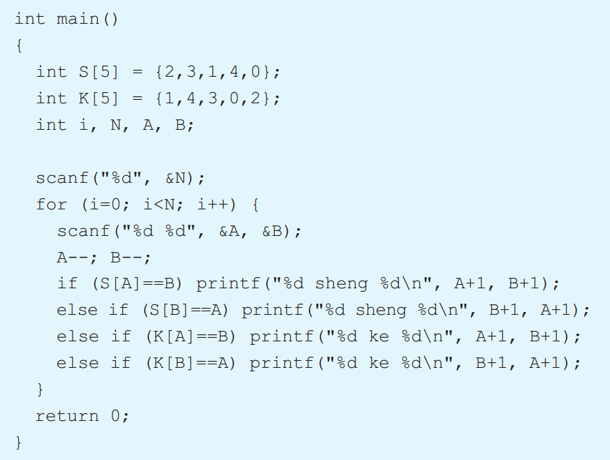 对输入的每一对 A和 B,如果 A生 B,则输出 “A sheng B”;如果 A克 B,则输出“ A ke B”;反之亦然。