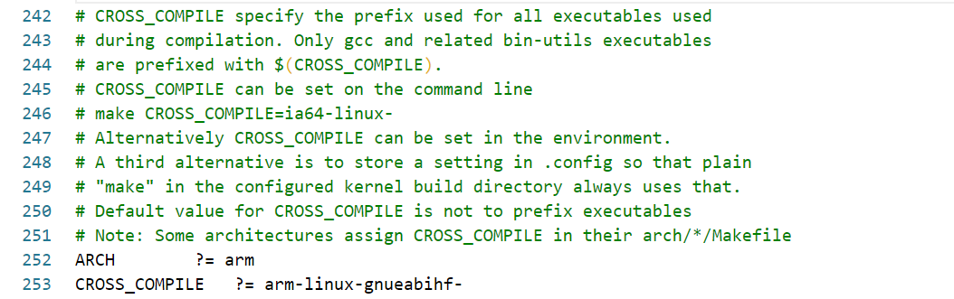 图34-1中第252和253行分别设置了ARCH和CROSS_COMPILE这两个变量的值,这样在编译的时候就不用输入很长的命令了。