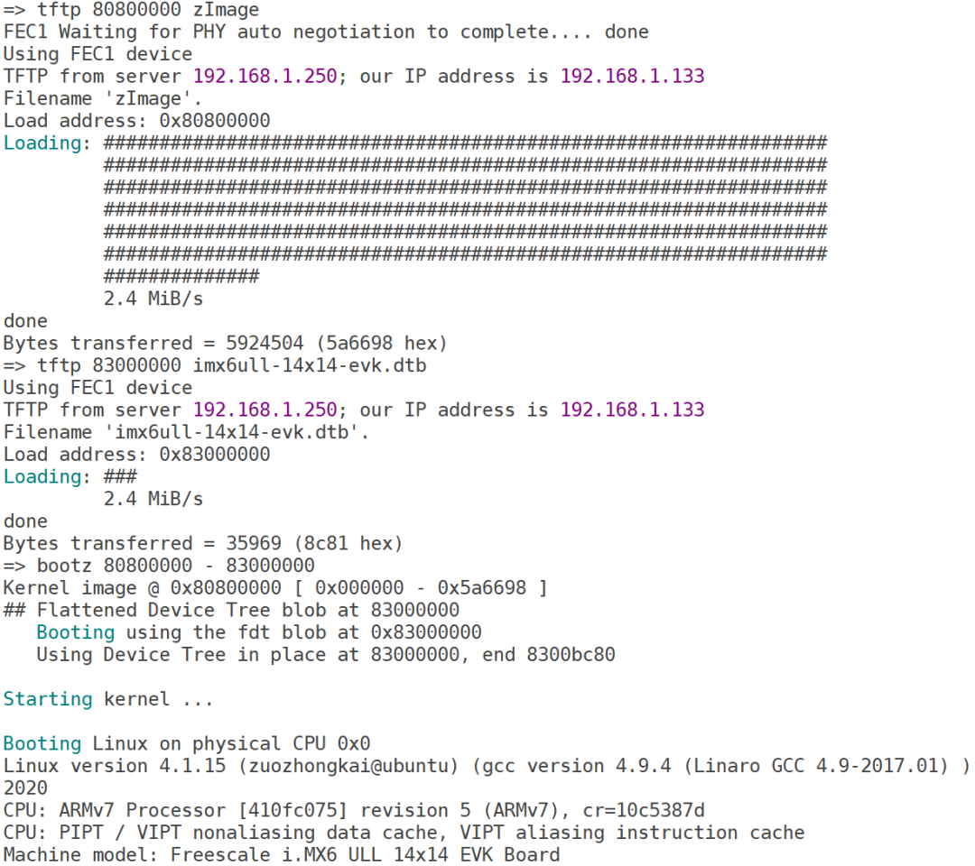 拷贝完成以后就可以测试了,启动开发板,进入uboot命令行模式,然后输入如下命令将zImage和imx6ull-14x14-evk.dtb下载到开发板中并启动:
