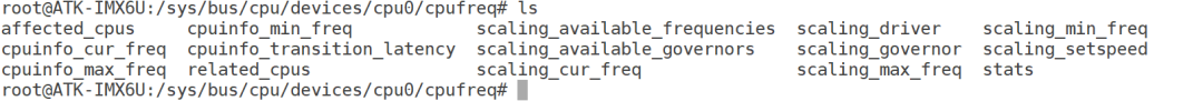 在图34-10中有BogoMIPS这一条,此时BogoMIPS为3.00,BogoMIPS是Linux系统中衡量处理器运行速度的一个“尺子”,处理器性能越强,主频越高,BogoMIPS值就越大。BogoMIPS只是粗略的计算CPU性能,并不十分准确。但是我们可以通过BogoMIPS值来大致的判断当前处理器的性能。在图34-10中并没有看到当前CPU的工作频率,那我们就转变另一种方法查看当前CPU的工作频率。进入到目录/sys/bus/cpu/devices/cpu0/cpufreq中,此目录下会有很多文件,如图34-11所示: