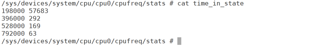 可以看出,当前CPU支持198MHz、396MHz、528MHz和792MHz四种频率切换,其中调频策略为ondemand,也就是定期检查负载,然后根据负载情况调节CPU频率。因为当前我们开发板并没有做什么工作,因此CPU频率降低为396MHz以省电。如果开发板做一些高负载的工作,比如播放视频等操作那么CPU频率就会提升上去。查看stats目录下的time_in_state文件可以看到CPU在各频率下的工作时间,命令如下:
