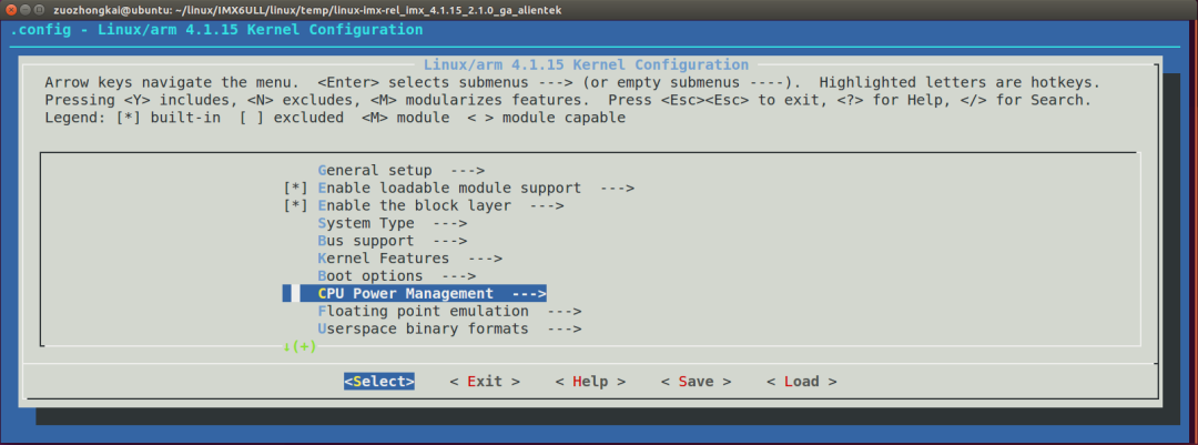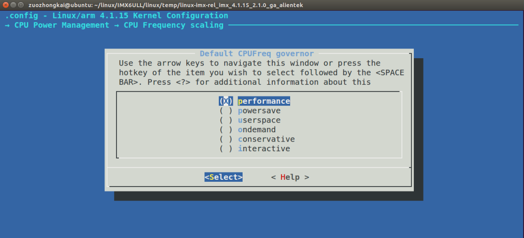 我们再来看一下如何通过图形化界面配置Linux内核的CPU调频策略,输入“make menuconfig”打开Linux内核的图形化配置界面,如图34-16所示: