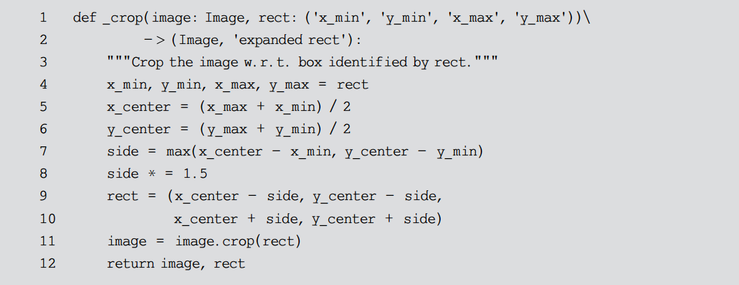 为了解决上述的第一个问题,将矩形框放大为方形框,因为方形图片容易进行等比例缩放而不会导致图像变形。对于第二个问题,则单纯地将方形框的边长延长为原来的1.5倍,以包含更多的脸部信息。相关代码如代码清单10-1所示。