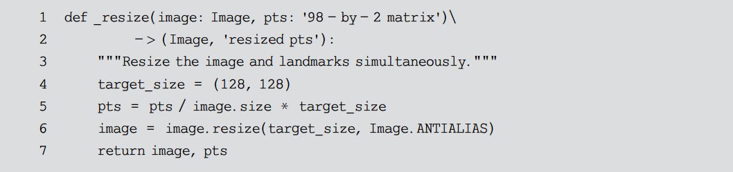 代码清单10-2将人脸图片和关键点坐标一并缩放至 128×128px。在 Image.resize()函数的调用中,第一个参数表示缩放的目标尺寸,第二个参数表示缩放所使用的过滤器类型。在默认情况下,过滤器会选用 Image.NEAREST ,其特点是压缩速度快但压缩效果较差。因此,PIL官方文档中建议是如果对于图片处理速度的要求不是那么苛刻,推荐使用 Image.ANTIALIAS 以获得更好的缩放效果。在本章项目中,由于 _resize() 函数对每张人脸图片只会调用一次,因此时间复杂度并不是问题。况且图像经过缩放后还要被深度模型学习,缩放效果很可能是决定模型学习效果的关键因素,所以这里选择了 Image.ANTIALIAS 过滤器进行缩放。图10.2经过裁剪和缩放处理后的效果图如图10.3所示。