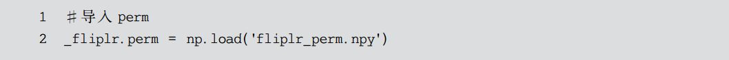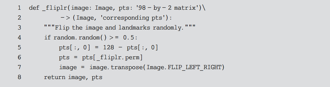 图片的翻转比较容易完成,只需要调用 PIL.Image 类的转置方法即可,但是关键点的翻转则需要一些额外的操作。举例来说,左眼 96 号关键点在翻转后会成为新图片的右眼 97 号关键点(见图10.1),因此其在 pts 数组中的位置也需要从 96 变为 97 。为了实现这样的功能,定义全排列向量 perm 来记录关键点的对应关系。为了方便程序调用, perm 被保存在文件中。但是如果每次调用 _fliplr()函数时都从文件中读取,显然会拖慢函数的执行;而将 perm 作为全局变量加载,又会污染全局变量空间,破坏函数的封装性。这里的解决方案是将 perm 作为函数对象 _fliplr() 的一个属性,从外部加载并始终保存在内存中,如代码清单10-5所示。