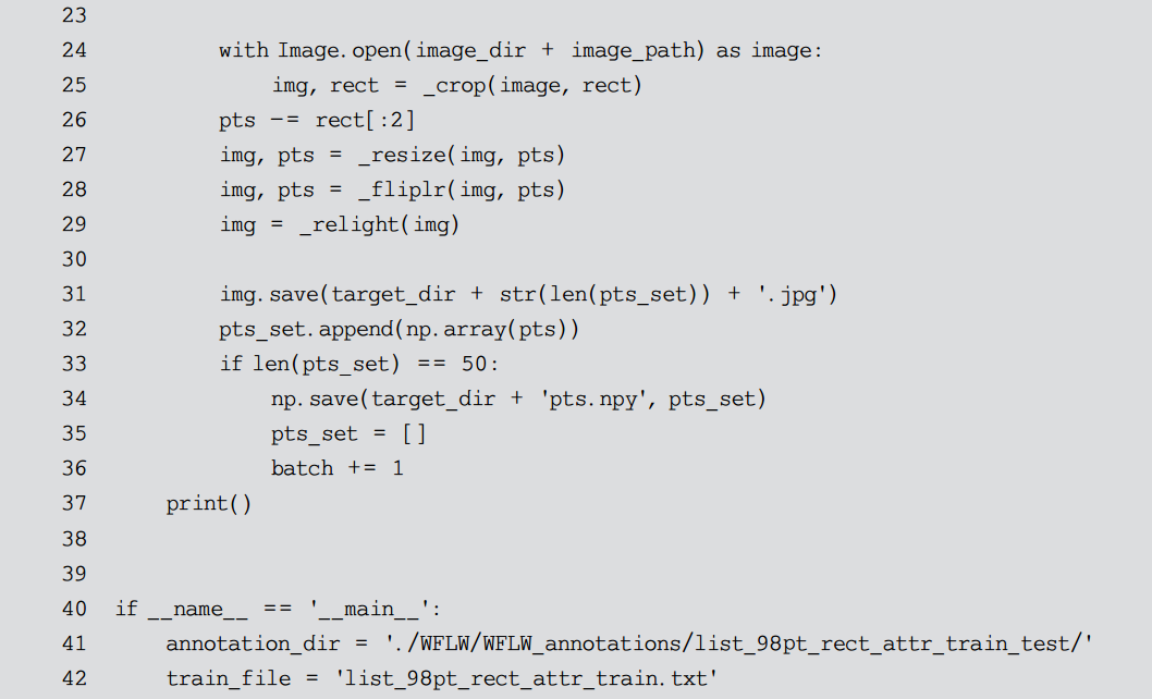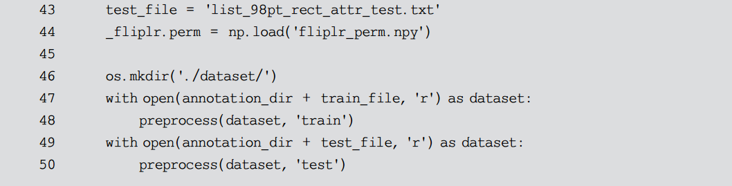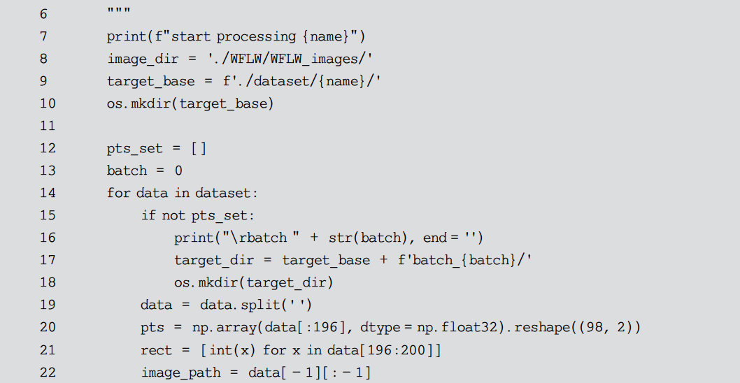 前面定义了对于单张图片的全部处理函数,接下来就只需要遍历数据集并调用即可,如代码清单10-6所示。由于训练集和测试集在 WFLW 中是分开进行存储的,但是二者的处理流程几乎相同,因此可以将其公共部分抽取出来作为 preprocess()函数进行定义。训练集和测试集共享同一个图片库,其区别仅仅在于人脸关键点的坐标以及人脸矩形框的位置,这些信息被存储在一个描述文件中。preprocess()函数接收这个描述文件流作为参数,依次处理文件中描述的人脸图片,最后将其保存到 dataset 目录下的对应位置。