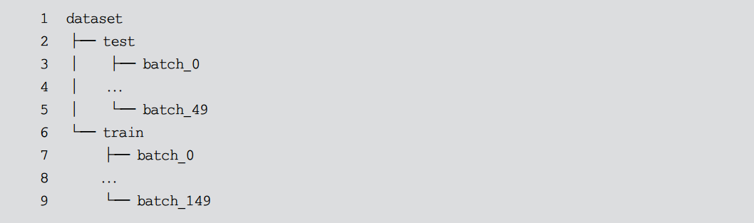 在preprocess()函数中,将 50 个数据组成一批 (batch) 进行存储,这样做的目的是方便模型训练过程中的数据读取。在机器学习中,模型训练往往是以批为单位的,这样不仅可以提高模型训练的效率,还能充分利用 GPU 的并行能力加快训练速度。处理后的目录结构如代码清单10-7所示。