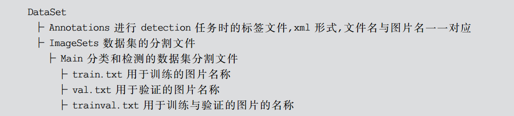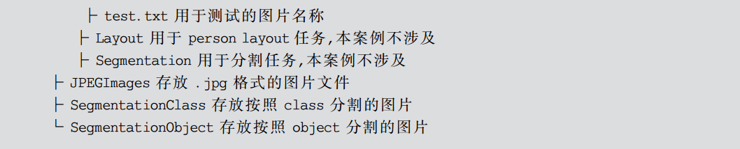 该数据集采用的是类似PASCAL VOC 数据集的结构。PASCAL VOC 数据集来自PASCAL VOC 挑战赛。该挑战赛是由欧盟资助的网络组织的世界级的计算机视觉挑战赛。PASCAL的英文全称为 Pattern Analysis, Statistical Modelling and Computational Learning。PASCAL VOC从2005年开始举办挑战赛,每年的内容都有所不同,从最开始的分类,到后面逐渐增加检测、分割、人体布局、动作识别等内容,数据集的容量以及种类也在不断地增加。目前,普遍被使用的是 VOC2007和VOC2012数据集两种,虽然是同一类数据集,但是数据并不相容,一般会将两组数据集结合使用。PASCAL VOC 数据集的基本结构代码如下: