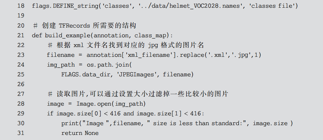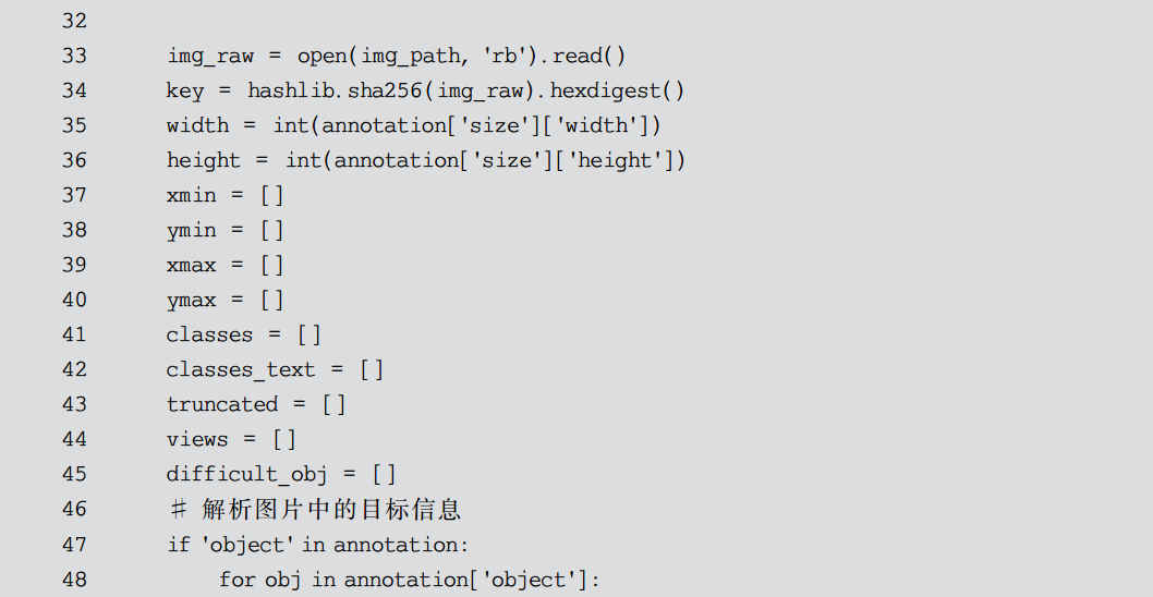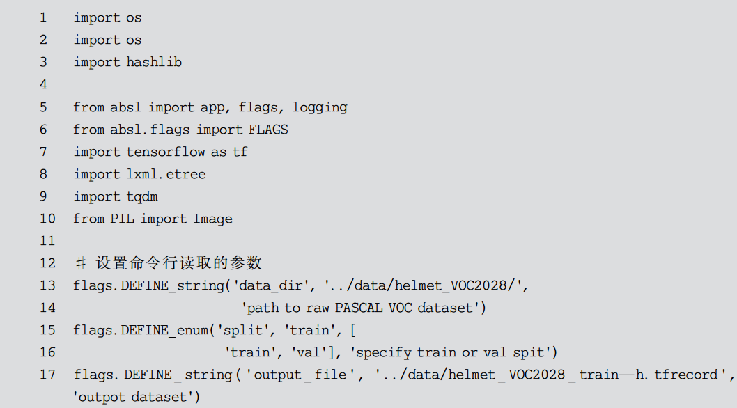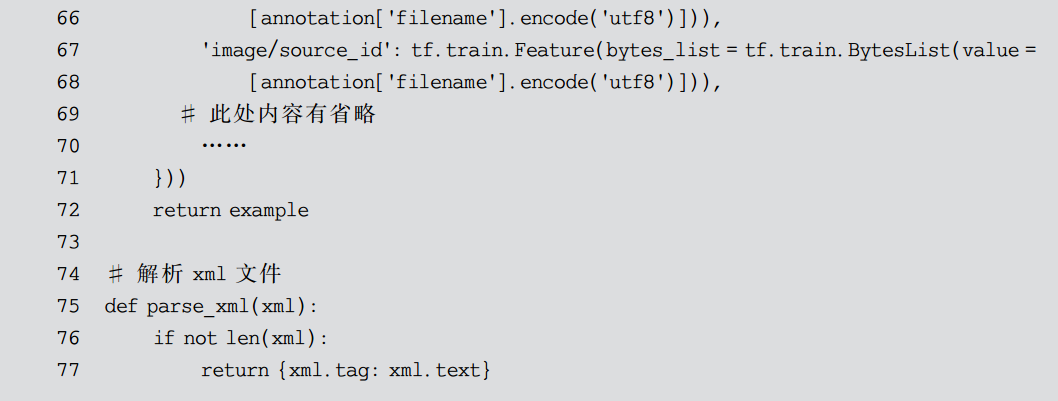 有时候,数据集的格式与模型读取所需要的格式并不相同,所以可以通过写脚本来进行格式转换。类似PASCAL VOC类型的数据集,会以目录区分训练数据集、测试数据集等,这种形式不但读取复杂、慢,而且占用磁盘空间较大。而 TFRecord 是 Google公司官方推荐的一种二进制数据格式,是Google公司专门为TensorFlow设计的一种数据格式,内部是一系列实现了Protocol buffers 数据标准的Example。这样,就可以把数据集存储为一个二进制文件,从而可以不用目录进行区分。同时,这些数据只会占据一块内存,而不需要单独依次加载文件,从而获得更高的效率。所以,需要将 PASCAL VOC 格式的数据转换为 TFRecord 类型的数据。相对应的转换代码和注释如代码清单9-1所示。