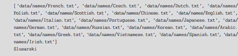 具体来说,这里将训练来自18种起源于不同语言的数千种姓氏,并根据拼写方式预测名称的来源,样例如下。