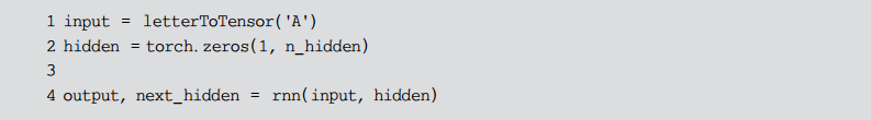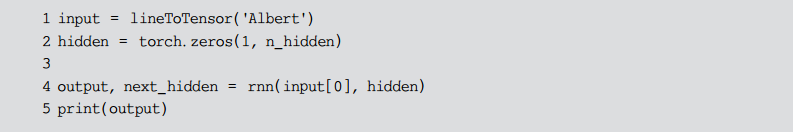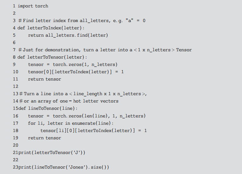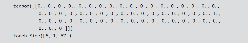 可以观察到数据的维度是<line_length×1×n_letters>,而不是<line_length×n_letters>,是因为额外的1维是因为PyTorch假设所有内容都是批量的——在这里只使用1的batchsize。