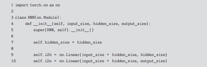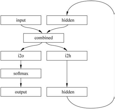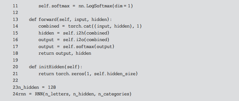 下面样例中的RNN模块只有两个线性层,它接受一个输入和一个Hidden State,之后网络输出结果需要经过一个LogSoftmax层。RNN模型如图11.1所示。