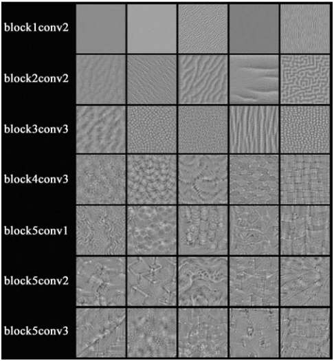卷积层中的不同卷积核会被特定的图像特征激活,图10.2展示了不同卷积层内卷积核的可视化(通过梯度上升得到)。可以看到,低层卷积核寻找的特征较为简单,而高层卷积核寻找的特征比较复杂。