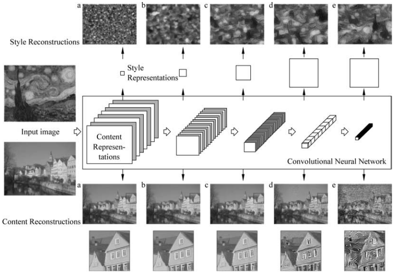 图10.3对风格迁移的内部过程进行了可视化。上面的一行中,作者将VGG网络不同层的输出构建风格表示,再反过来进行可视化,得到重构的风格图片;下面的一行中,作者将VGG网络不同层的输出构建内容表示,再反过来进行可视化,得到重构的内容图片。可以看到,低层卷积层提取的风格特征较细节,提取的内容特征较详细;高层卷积层提取的风格特征较整体,提取的内容特征较概括。