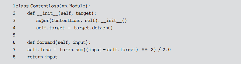 模块在初始化时需要将内容图片的特征图传入,通过detach()方法告诉AutoGrad优化时不要变更其中的内容。forward()方法实现上面的公式即可。