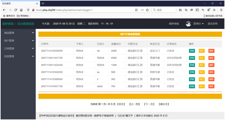 对于电子商务系统的后台管理者,用户订单信息的管理是最重要的。所以,本项目的后台首页上显示的是“用户订单信息”,如图9.5所示。