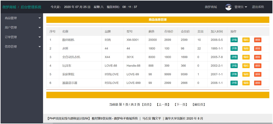 商品信息的显示与上述系统后台首页中订单的显示相似,只不过此时操作的是商品信息表wm_goods中的数据。页面效果如图9.20所示。