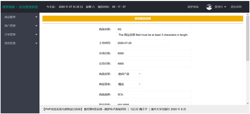 从上述代码可以看出,商品信息的添加总体上分为三个步骤,即表单数据的接收、表单数据的验证和数据的保存。