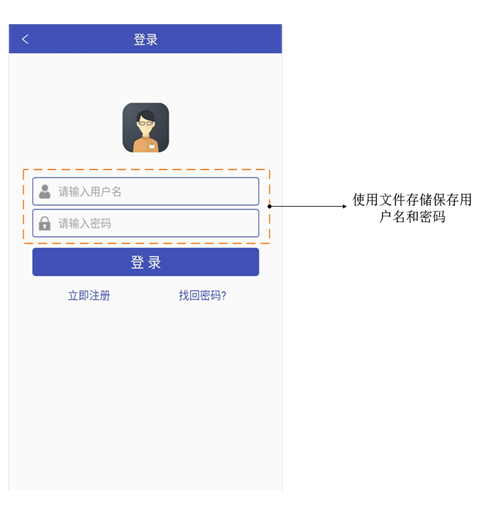 登录页面当用户第一次登录的时候需要输入用户名和密码,当用户输入正确的用户名和密码后将用户名和密码保存在本地设备上,当用户下一次登录时,自动读取保存的用户名和密码,实现自动登录,如图7-1所示。