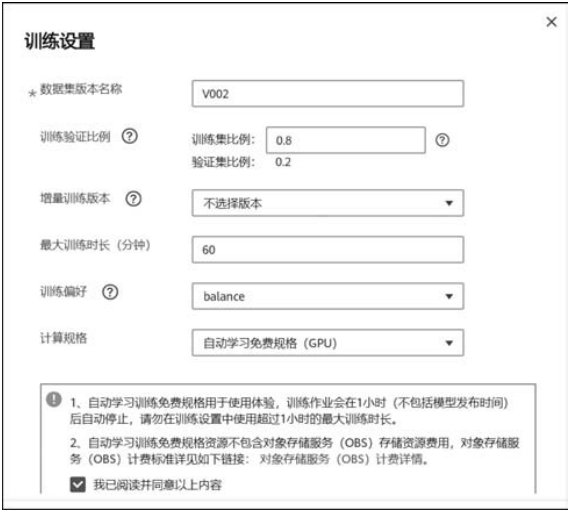 (6) 计算规格。计算规格即选择训练使用的资源规格,默认支持两种:增强计算型1实例-自动学习(GPU):按需计费的规格;自动学习免费规格(GPU):免费规格,使用此规格不收费。但是使用此规格时,训练作业在60分钟后会自动停止,即1次最多只能使用60分钟。建议评估下数据大小,确保训练作业不要超过60分钟。当使用人数较多时,此免费规格需排队等待。