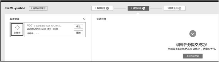单击“下一步”按钮,确认配置后,单击“提交”按钮,即可开始模型的自动训练,如图9-31所示。训练时间相对较长,建议耐心等待。如果训练中关闭或退出此界面,那么系统会继续执行训练操作。