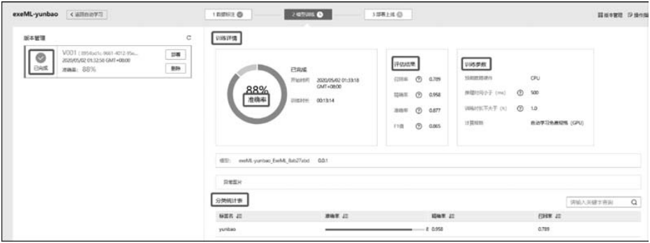 模型训练完成后,可以在界面中查看训练详情,如“准确率”“评估结果”“训练参数”“分类统计表”等,如图9-32所示。