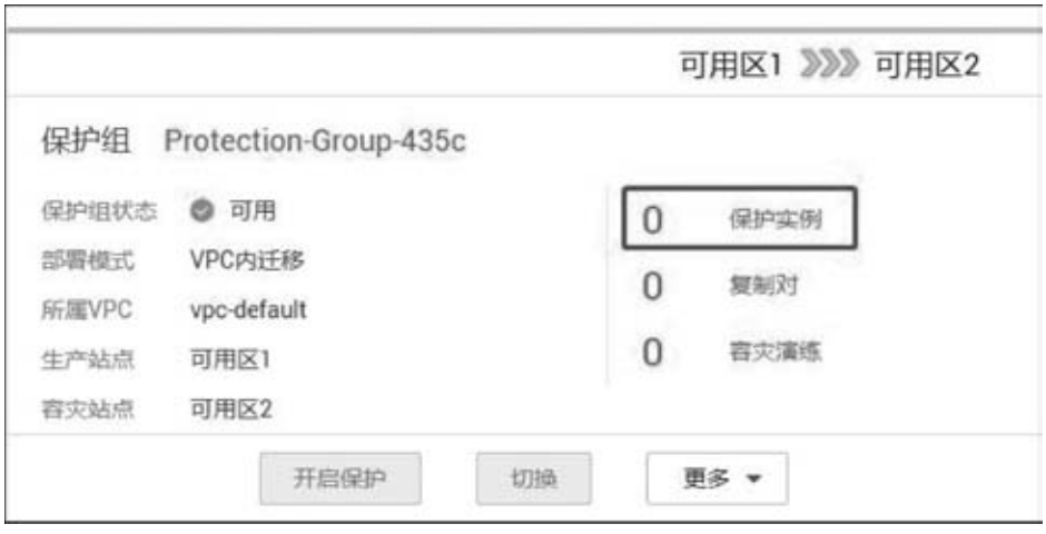 (1) 选择保护组。在存储容灾服务控制台界面下,显示所有已创建的保护组,根据需要选择需创建保护实例的保护组。在每个保护组的界面上显示着该保护组所在区域、容灾方向、所属VPC、保护实例、复制对等信息,如图5-14所示。