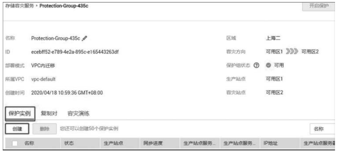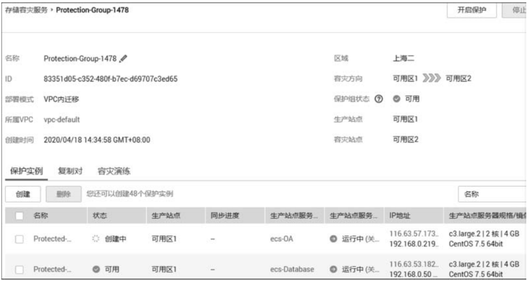同样,重复上述创建保护实例步骤,对生产站点的ecs-Database实例创建保护实例。创建两个保护实例后的界面如图5-18所示。当保护实例的状态由“创建中”变为“可用”时,表示创建保护实例成功。由此可看出,同一个保护组内,可以添加不同的ECS实例。
