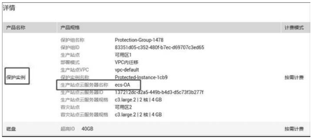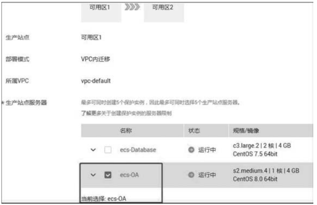 (3) 选择保护实例。在图5-15所示界面中,在生产站点服务器中选中要保护的云服务器,此处选择esc-OA服务器实例,如图5-16所示。选中ecs-OA后,容灾站点的服务器和云硬盘便自动处于选择状态,此时可以命名保护实例的名称,也可保持默认,最后单击界面右下角的“立即申请”按钮,打开如图5-17所示的规格确认界面,确认无误后,单击界面下方的“提交”按钮,系统开始创建保护实例。