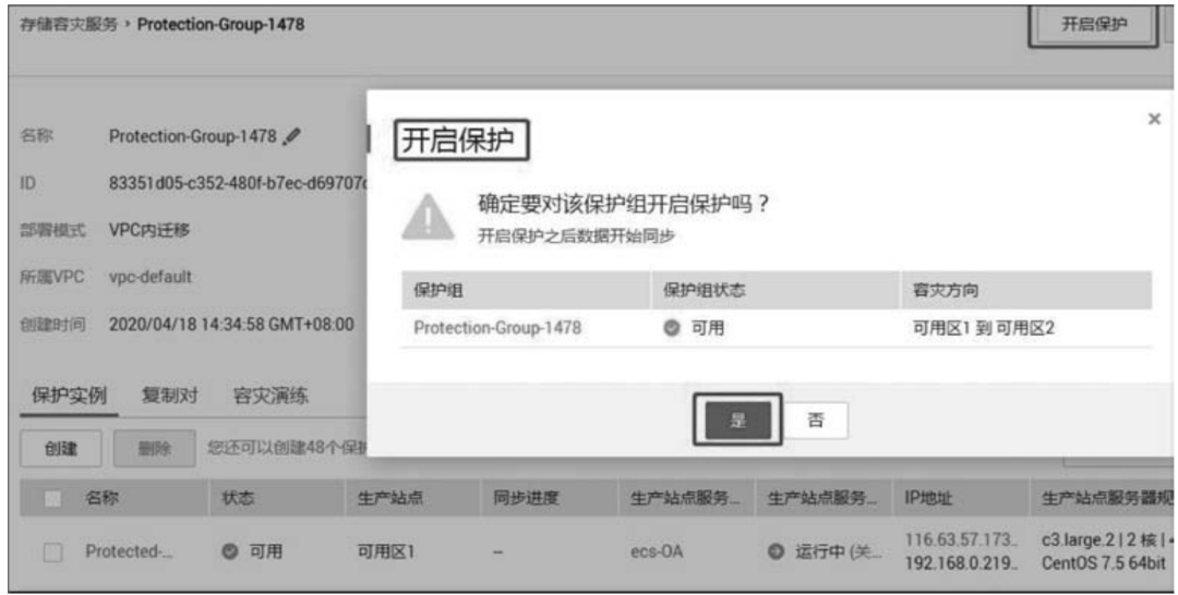 保护实例创建完成后,进入保护组详情页,待所有保护实例状态均为“可用”的时候,单击界面右上角的“开启保护”按钮,在弹出的对话框中,单击“是”按钮,如图5-19所示。之后系统开始做数据的首次同步,同步时间为6~10分钟,这取决于被保护实例的云硬盘大小以及数据量大小。