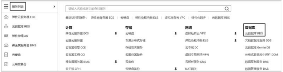 登录华为云网站,进入云控制台界面,选择界面上方导航栏中的“服务列表”链接,选择“数据库”中的“云数据库RDS”选项,如图4-7所示。