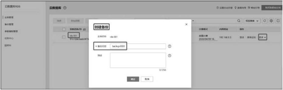 选择关系型数据库列表中需要备份的数据库实例,单击“更多”按钮,在弹出的菜单中选择“创建备份”链接,在弹出的数据库备份窗口中输入备份名称,此处输入backup-0001,最后单击“确定”按钮,系统会立即开始备份数据,如图4-8所示。