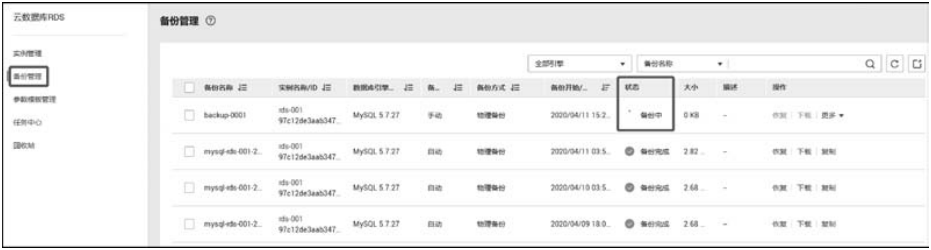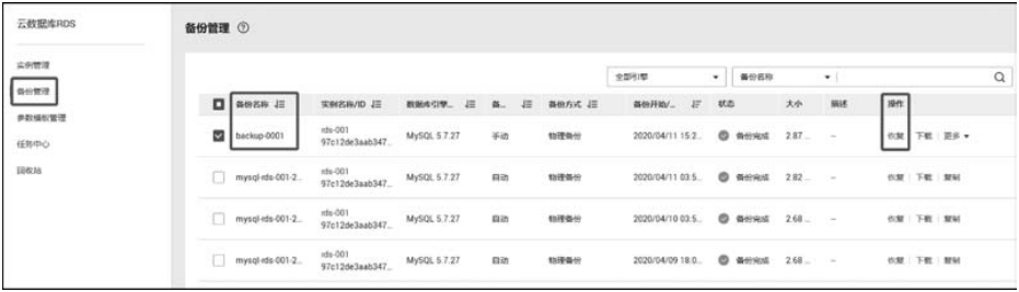 返回“云数据库RDS”控制台,选择左侧导航栏中的“备份管理”选项,选择本章第4.3节中创建好的数据库备份backup-0001,如图4-11所示。
