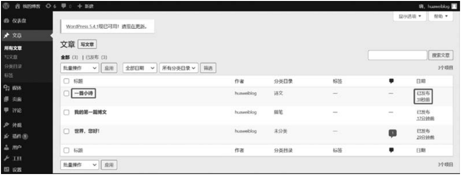 在第4.3节已经完成了云数据库的备份操作。为了验证数据库的恢复操作,对云数据库进行更新,然后再将其恢复到第4.3节备份时的状态。首先在客户端本机登录WordPress博客网站,然后发布第二篇博文,如图4-10所示。