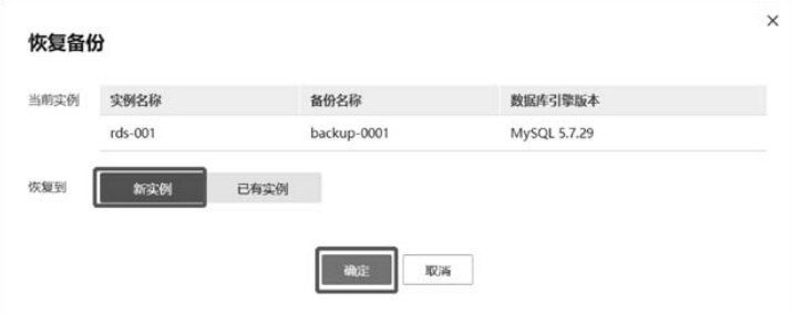 在图4-11所示界面中,单击“恢复”按钮,弹出“恢复备份”对话框,选择恢复到“新实例”选项,单击“确定”按钮,如图4-12所示。RDS for MySQL不支持将备份恢复到原实例,如有需要,请先将备份恢复到新实例,然后将该实例的IP修改为原实例的IP即可。