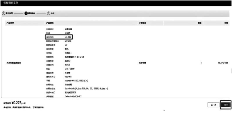 在图4-12所示界面中,单击“确定”按钮后,界面跳转到“恢复到新实例”对话框,恢复到新实例即是创建一个跟当前实例rds-001配置一样的云数据库服务器实例,为区分两者,将新实例命名为rds-002。单击“提交”按钮,开始创建新的云数据库实例,如图4-13所示。