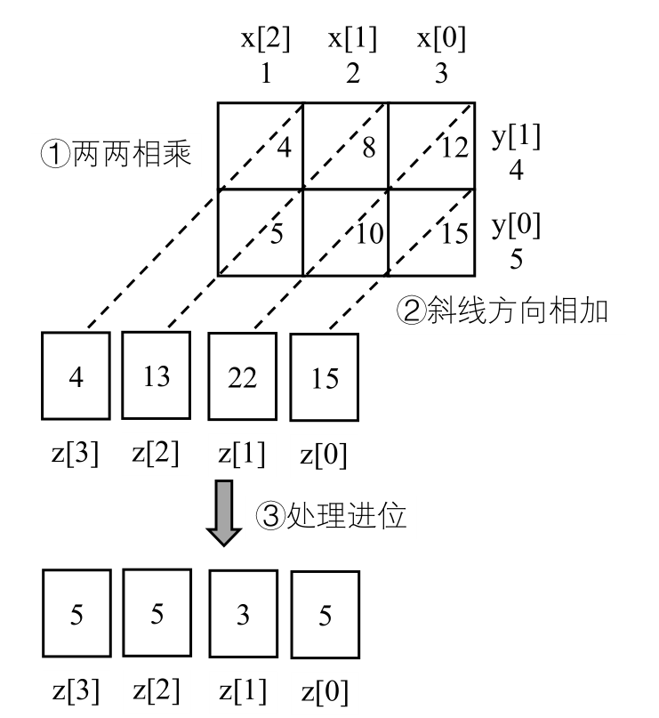 再从低位到高位处理z,实现进位操作,即若z[i]≥10,求出进位数re=z[i]/10和余数z[i]%=10,再执行z[i+1]+=re将进位数累加到更高位中。最后输出z。