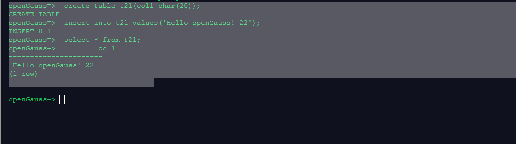 openGauss=> insert into t21 values('Hello openGauss! 22');