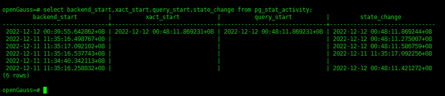 select backend_start,xact_start,query_start,state_change from pg_stat_activity;