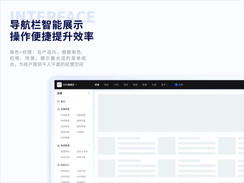 为了更好地匹配企业多场景、组织、角色的经营需求,此次WOS优化了后台交互方式,根据“场景”+“功能”的设计思路,系统会依据商户的具体角色、权限、场景展示出此刻最匹配的导航功能设置,节省商家操作步骤,提供更为专注、千人千面的经营空间。同时为了更好地帮助商家提升运营效率,提供了新手引导、内容指引、帮助引导,辅助商家高效运营。