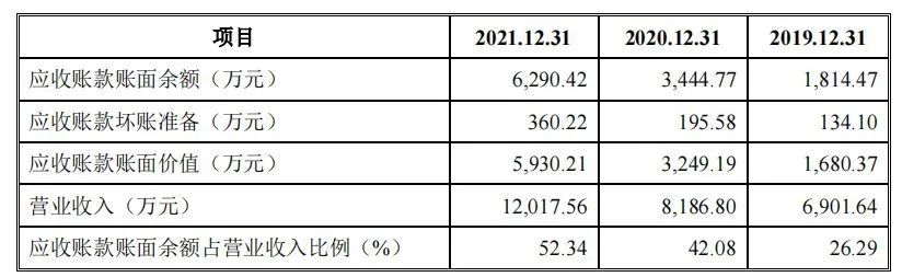 小财米儿发现,与其他不少欲上市的企业一样,近三年中创股份应收账款占比持续提升,风险逐渐累积、凸显。招股书显示,2019—2021年,中创股份应收账款账面余额分别为1,814.47万元、3,444.77万元及6,290.42万元,占企业资产总额的比例分别为18.09%、23.88%及17.48%,同时占当期营业收入的比例分别为26.29%、42.08%、52.34%,整体呈现逐年升高之势,占比较高,尤其是2021年应收账款余额已占营收的一半以上。