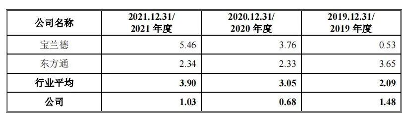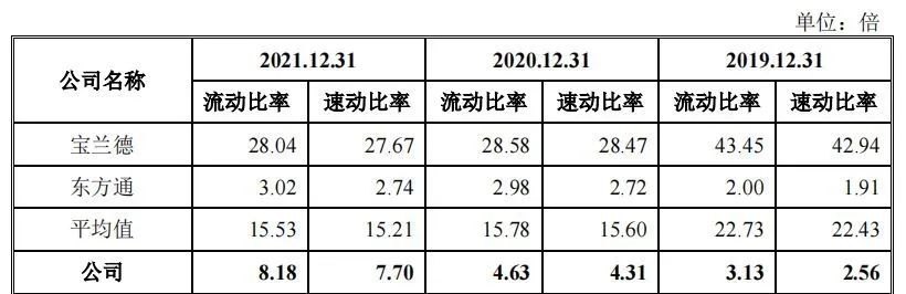 另外,2019—2021年,中创股份资产负债率分别为32.78%、24.72%及16.69%,虽然整体呈现下降趋势,但均比同行业可比公司宝兰德、东方通要高近一倍,差距较大,如下图:
