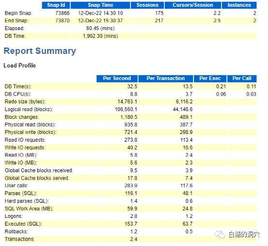 从AWR上看,DB TIME确实很高,和Load Profile完全对不上,从上面的数据可以看出,系统的负载极小,每秒的执行数仅为153。不过负载不高有两种可能性,一种是从上游来的SQL并发量就很小,还有一种可能性是当时系统出现问题,形成了一定的阻塞,因此并发量下降了。
