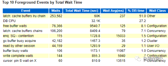 从TOP等待事件上看,排在第一位的是lru链的闩锁等待,这种等待并不常见,我们见得比较多的是CBC闩锁等待。这个闩锁等待一般来说是DB CACHE不够用的时候才会出现的。在如此小的并发访问下出现此类等待确实是十分罕见的。不过看到排在第三位的free buffer waits以及后面的write complete waits等待心里就有点数了,从这里可以看出是因为DBWR写脏块太慢才导致了free buffer wais,从而引发了LRU链闩锁等待。