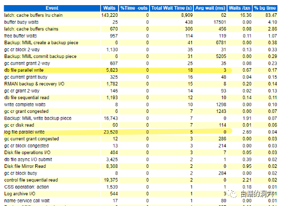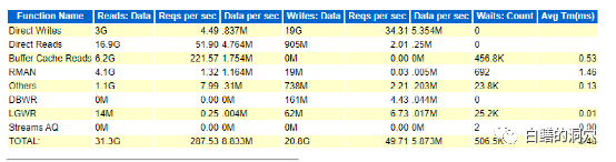 没想到写IO的性能指标并无大碍,文件写平均延时3毫秒,日志写平均延时不到1毫秒,按理说这样的写IO性能不会产生如此大的影响。不过从后台进程等待中我们也发现了一些特殊的东西,比如发现当时存在备份相关的等待。因为无法直接得出结论,所以必须继续查看更多的信息。