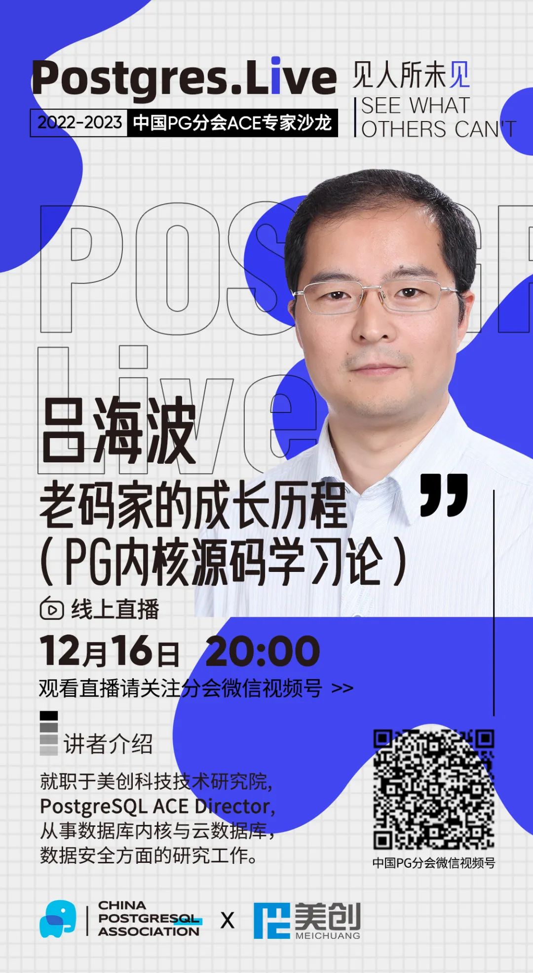 大家好,受疫情影响中断许久的Postgres.Live线上系列沙龙又开始了,新的沙龙定位于国内外 ACE 专家的高端技术分享,时间在每周四或周五晚20:00-21:00,主要面向PG数据库内核、应用、运维、开发、产业与职业发展等主题进行分享和互动,欢迎广大PostgreSQL用户和爱好者走进我们的直播间,与讲者专家积极互动,更有好礼相送哦!