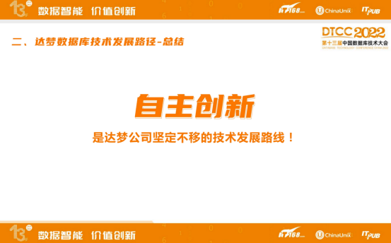 付新强调,自主创新,是达梦公司坚定不移的技术发展路线。未来,达梦将坚持走博采众长、独立自主的技术路线,保持对数据库前沿技术的跟踪、学习,同时坚持核心代码自主研发;继续和高校建立联合实验室,探索数据库前沿技术,培养数据库人才;组建达梦研究院,将具有应用前景的数据库前沿技术工程化、产品化;遵循市场需要什么就做什么的原则,很多产品/技术方向的确定也都是来源于实际用户需求。