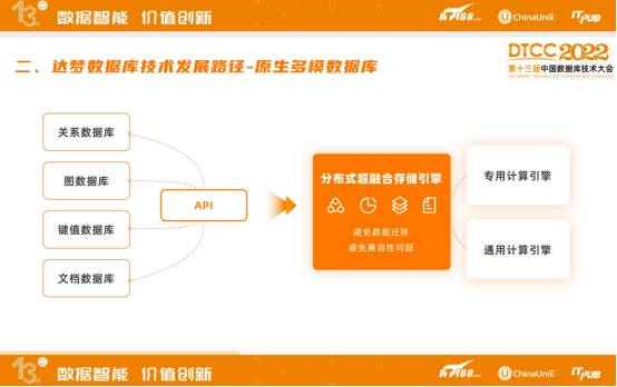 而在融合方面,付新重点介绍了达梦在存储引擎融合方面的建设。达梦提出用一种存储模型支持多种不同业务场景(图、关系、KV、文档)。付新指出,目前国内外主流的多模数据库是用多个不同的存储引擎支持不同业务场景,当场景切换时还需要进行数据的迁移、同步等操作,给用户带来复杂度。达梦用一种存储模型支持多种不同业务场景,通过把图的技术应用到关系数据库,可以带来包括查询优化技术的进化、分析性能的大幅提升。