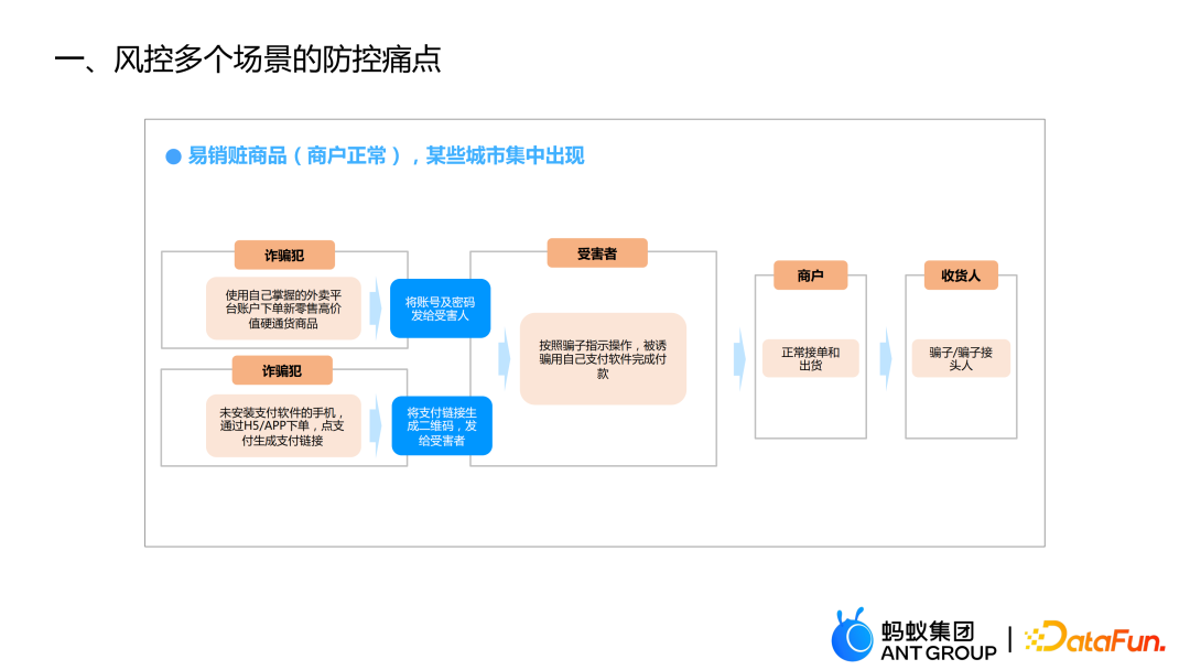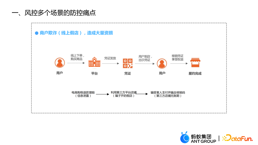 第二个风险场景是欺诈商户通过开线上假店,造成大量资损。