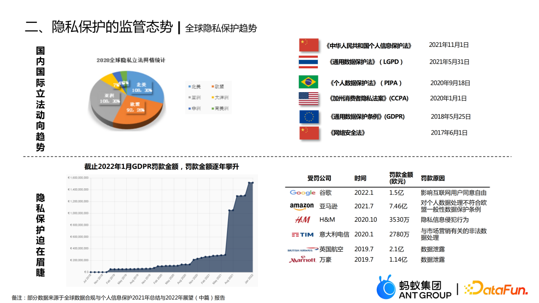这些立法能够看出全球对于个人隐私保护的重视程度越来越高,对于法案的执行力度越来越高。从上图左下角的 GDPR 执行罚款的历史折线图可以看到,罚款金额逐年攀升,尤其是在 2020 年以后,处罚金额攀升幅度越大越大。其中,2021 年 7 月,亚马逊因为对个人数据处理不符合欧盟一般性数据保护条例被罚款 7.46 亿欧元,创下了目前 GDPR 罚款最高的记录。许多知名公司都由于触犯了隐私法案被罚款,如国内滴滴因为用户信息泄露问题而被处罚了 80 多亿人民币。